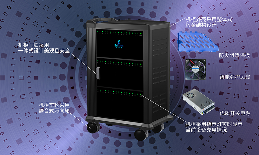 外部構造簡單,內部構造也并不復雜。充電柜內部主要構造有ABS充電隔板,讓設備在充電時更加安全,讓其發熱起火概率無限接近于0;強勁的智能散熱風扇會在充電柜內部溫度達到30℃以上時,自動開啟散熱功能及時確保充電柜內部發熱安全問題;優質的開關電源為整個機柜的提供高安全高效率的充電體驗,一個簡單的內部構造能夠使設備發生故障時及時發現故障原因然后及時解決故障提高充電柜的整體壽命,增強整個平板電腦充電柜產品的性價比。