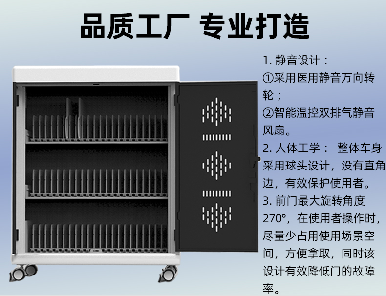 1.靜音設計: ①采用醫用靜音萬向轉輪; ②智能溫控雙排氣靜音風扇。★