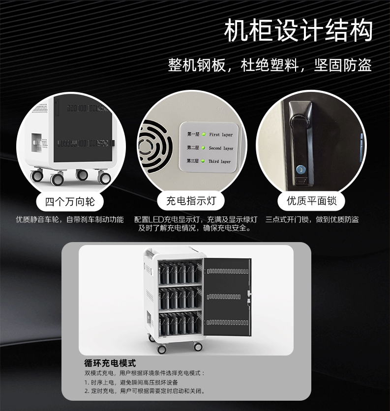 模式B:全直充模式  1)時序上電,避免瞬間高壓損壞設備     2)所有電腦同時充電。當用電環境屬于大功率安全用電環境,用戶可選擇非循環充電模式,快速充電
